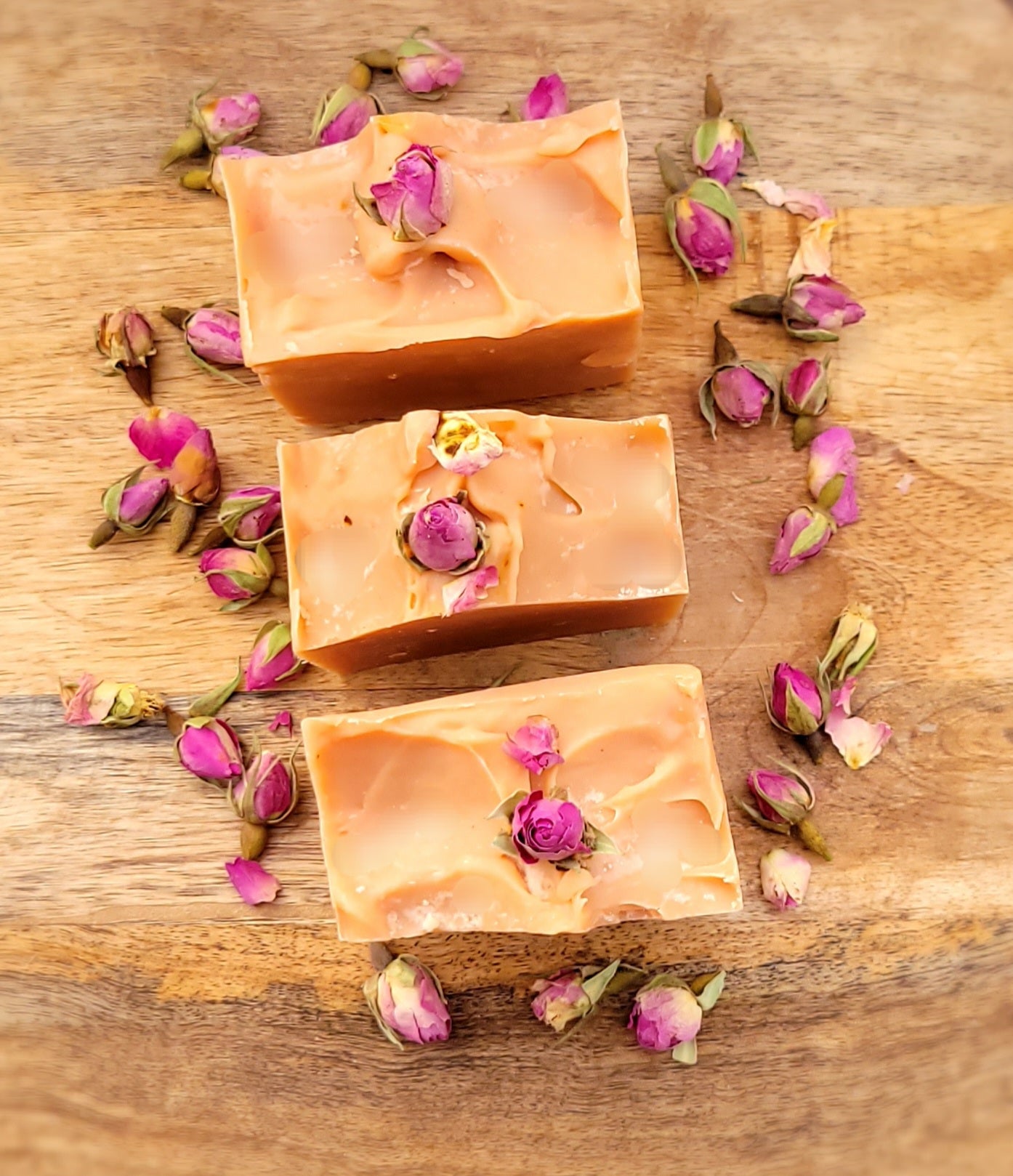 Ingredients: Saponified Extra virgin olive oil, coconut oil, shea butter, cocoa butter, castor oil and distilled water. Rose buds for topping and French pink clay for coloring.